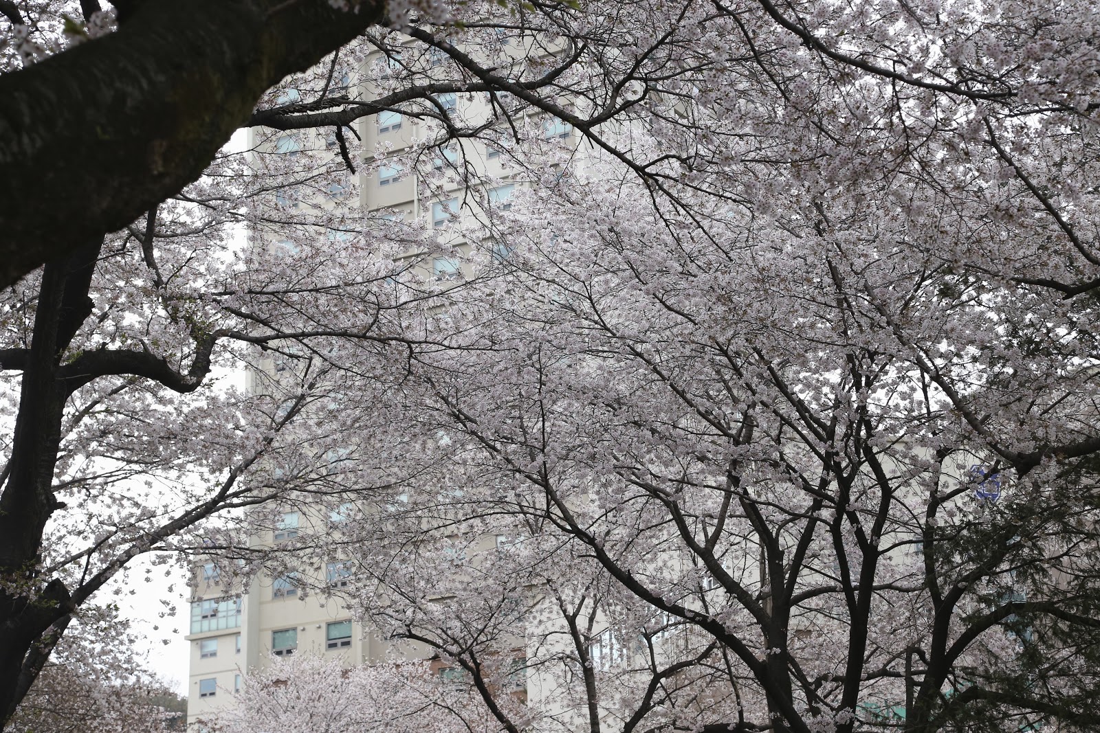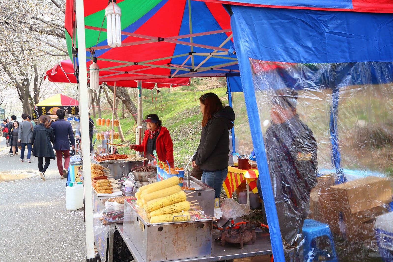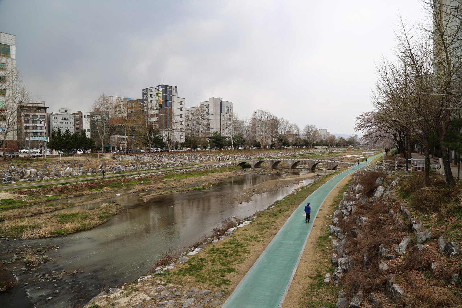 After Dunsan, I took the subway to the Chungnam University area to go to the Cherry Blossom Festival. I decided just to go by myself so I could enjoy the day leisurely and take tons of photographs. The weather changed all of a sudden, and it got cloudy. Bye-bye blue skies. Hello gray ones. However, I think it’s beautiful. This river runs throughout Daejeon, and you often find walkers and joggers along the river.