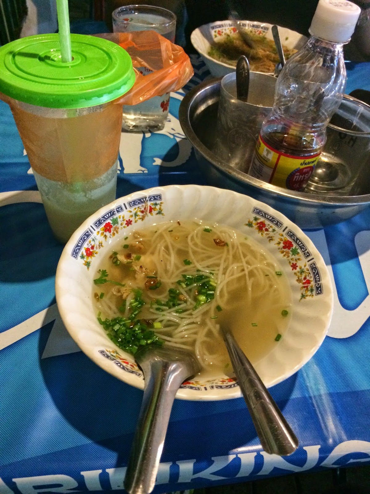 Noodle soup with chicken and a cantaloupe and pineapple smoothie! all for a little more than a dollar.