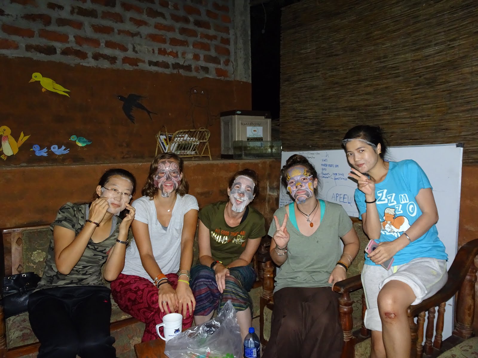 The night we wore weird Chinese face masks supplied by Cheng. From left: Yufei, Bri, Kylie, me, Cheng |