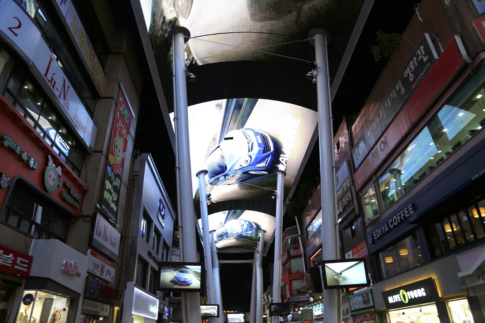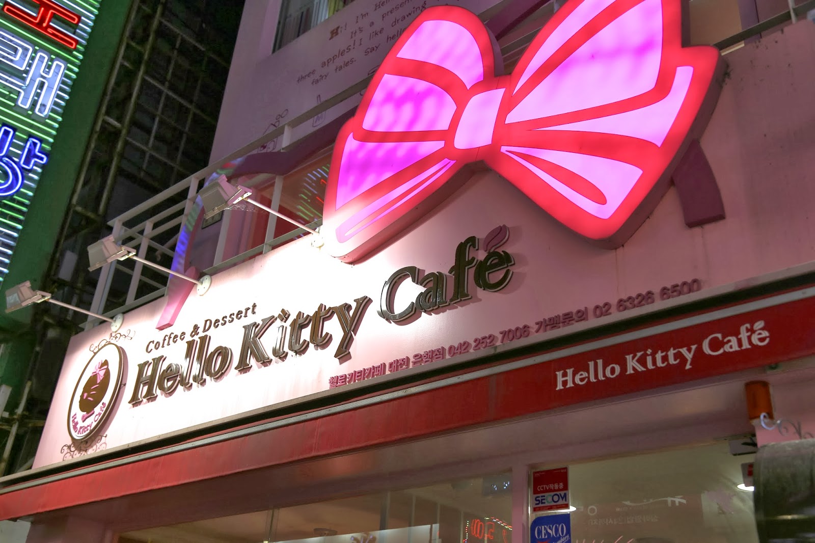 Eunhaeng-dong, or Old Downtown, is one of my favorite places in Daejeon.  I just love it.  They have this huge bridge-like screen which shows cartoons, music videos, commercials, etc.  It’s so pretty at night.  Hello Kitty Cafe was down one of the side streets right off this main street.  I tell you, if I was a little girl, I would have LOVED it.  Seriously.  I could picture little girls having their birthday party there.