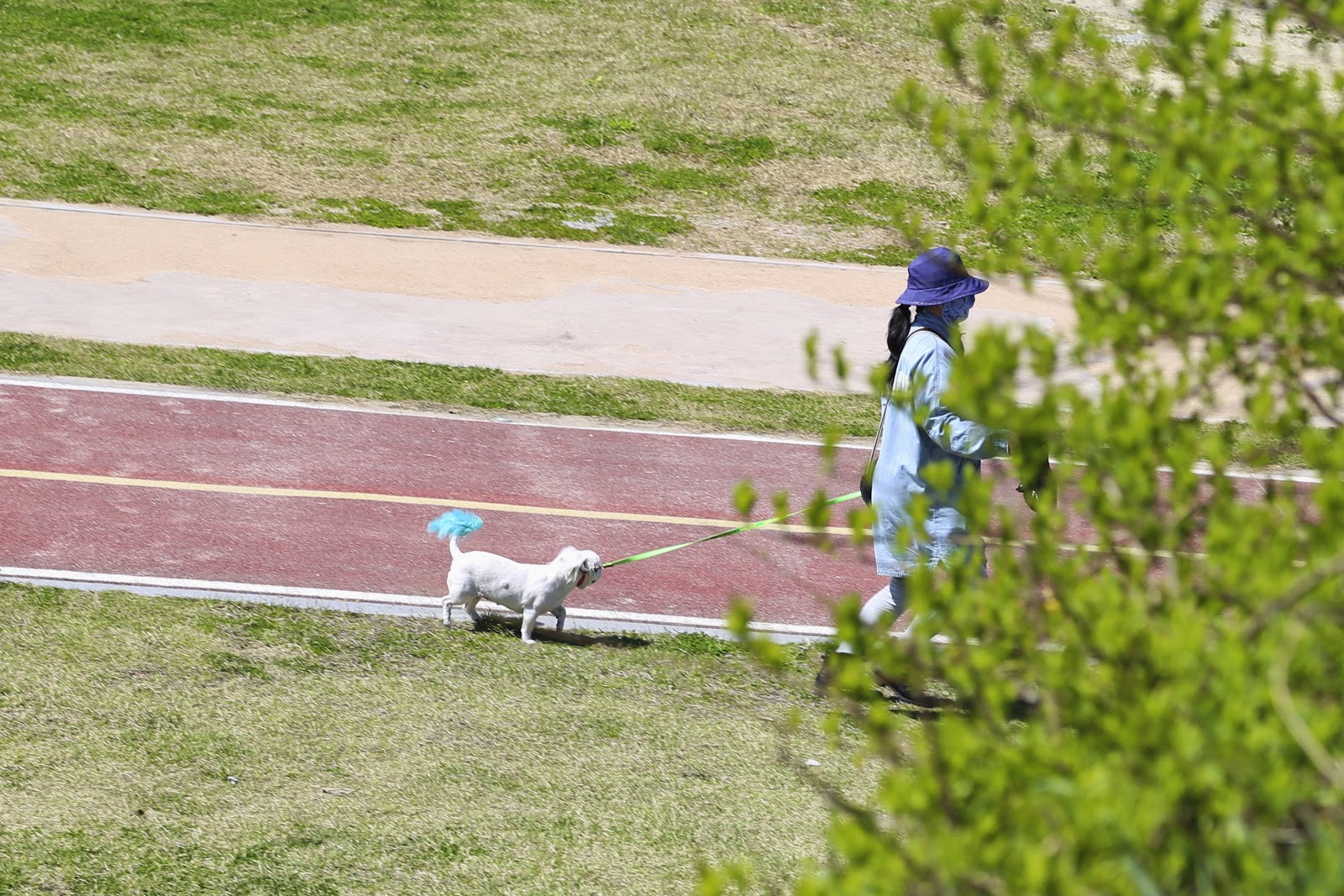 Yes, that dog’s tail is bright blue. His sister’s tail was bright pink.
