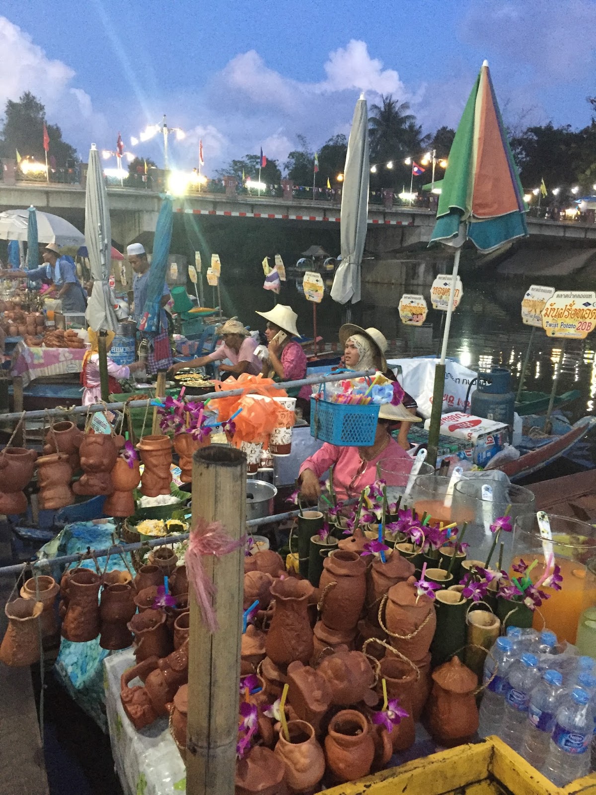 Rainy season in the South of Thailand is upon us, but we still try to explore the city of Hat Yai and its surrounding province of Songkhla, even if that means we get completely drenched and muddy from one of the many downpours. A few weekends ago, we decided to check out the Khlong Hae Floating Market. This market is filled with music, shopping, food and beer (always lots of beer). The market gets its name from the many docked boats that line the peer. On each boat sits a lovely lady or gentlemen, usually under a cute umbrella, preparing and cooking their specialty food. They hand you your food in a basket attached to a long stick. It’s pretty adorable. Like I’ve mentioned before, Hat Yai has very few westerners, so it’s always a fun experience going to places like this because everyone is beaming with kindness and excited to meet us. I do have to admit that the constant staring and whispering on a daily basis gets a little weird. We often hear the Thais say to their friends “farang, farang” (meaning foreigner/white person) … which is then followed by a group of Thais turning their heads and staring at us in bewilderment. But we’ve decided to embrace it and just smile back!